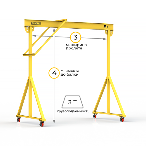 Мини-кран козловой мобильный ручной (МПУ) усиленной конструкции с раскосами Мобиус-R1 с грузоподъемностью до 3 тонн, с высотой до балки 4 метра и шириной пролета 3 метра, это компактное устройство, для подъема и перемещения грузов на небольшие расстояния. Кран адаптирован для работы в помещениях, и может быть использован на улице.