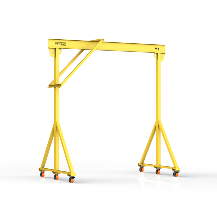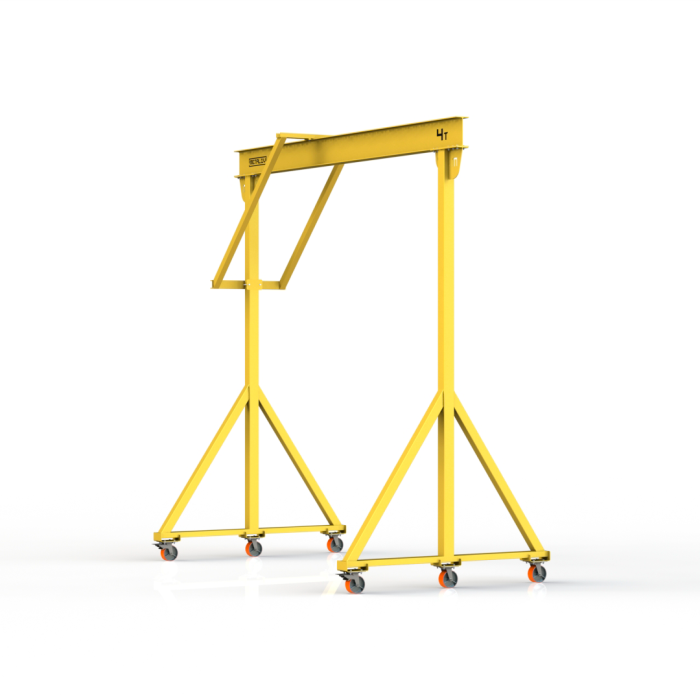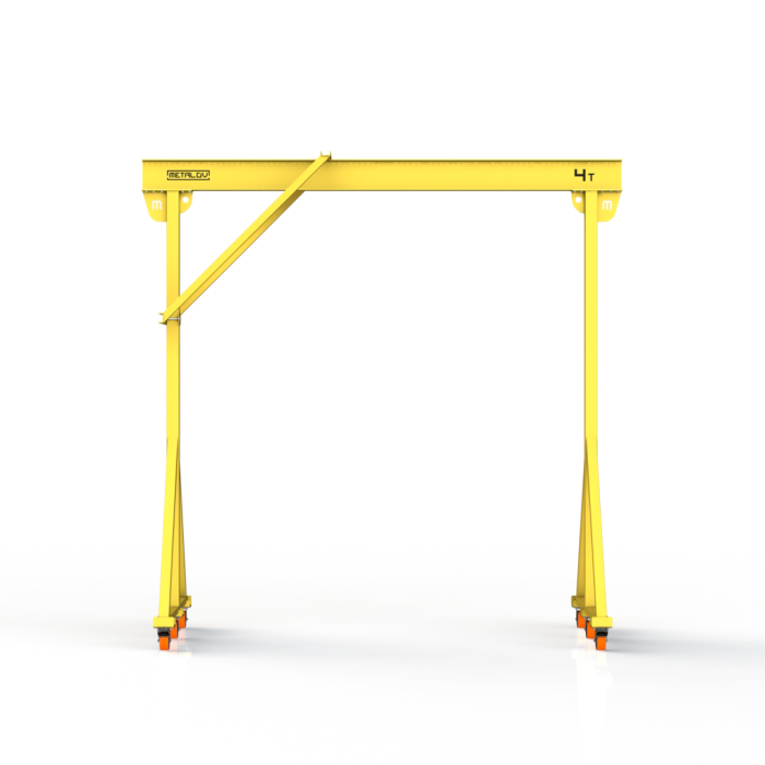Мини-кран козловой мобильный ручной (МПУ) усиленной конструкции с раскосами Мобиус-R1 с грузоподъемностью до 4 тонн, с высотой до балки 3 метра и шириной пролета 2 метра, это компактное устройство, для подъема и перемещения грузов на небольшие расстояния. Кран адаптирован для работы в помещениях, и может быть использован на улице.