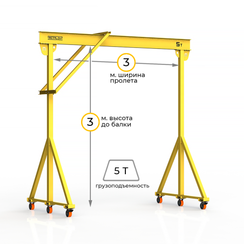 Мини-кран козловой мобильный ручной (МПУ) усиленной конструкции с раскосами Мобиус-R1 с грузоподъемностью до 5 тонн, с высотой до балки 3 метра и шириной пролета 3 метра, это компактное устройство, для подъема и перемещения грузов на небольшие расстояния. Кран адаптирован для работы в помещениях, и может быть использован на улице.