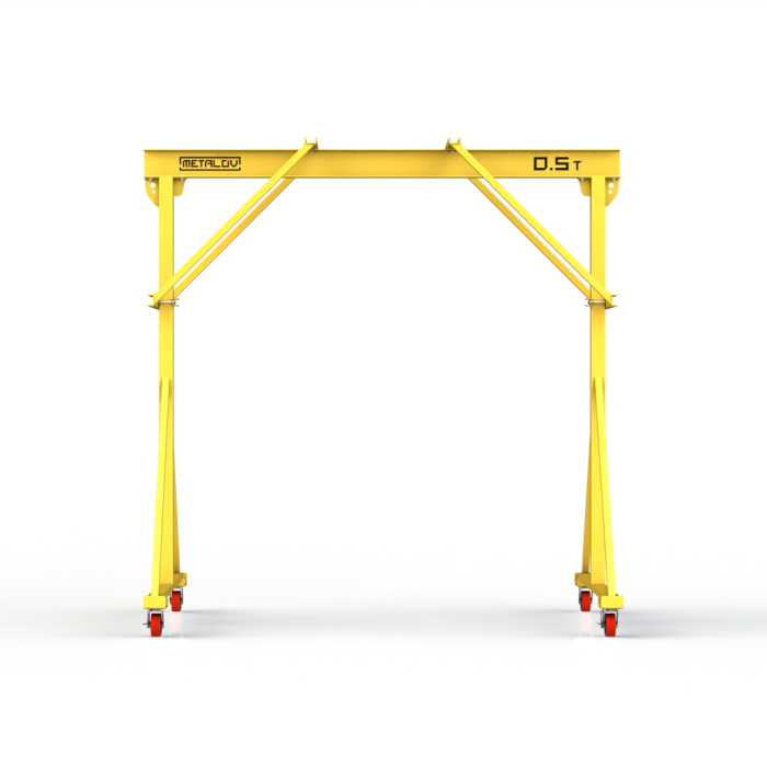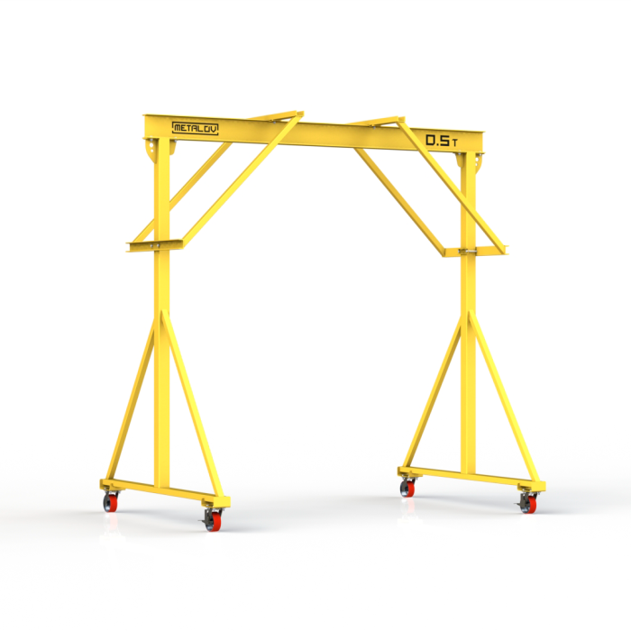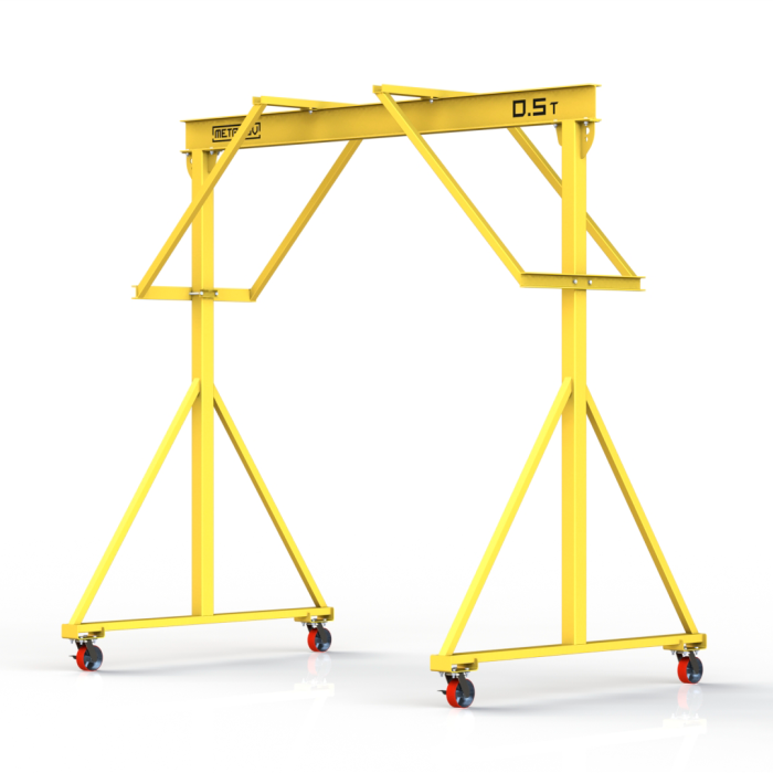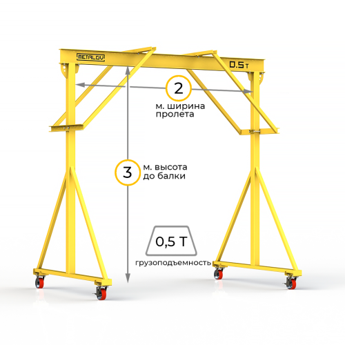 Мини-кран козловой мобильный ручной (МПУ) усиленной конструкции с раскосами Мобиус-R2 с грузоподъемностью до 500 килограмм, с высотой до балки 3 метра и шириной пролета 2 метра, это компактное устройство, для подъема и перемещения грузов на небольшие расстояния. Кран адаптирован для работы в помещениях, и может быть использован на улице.