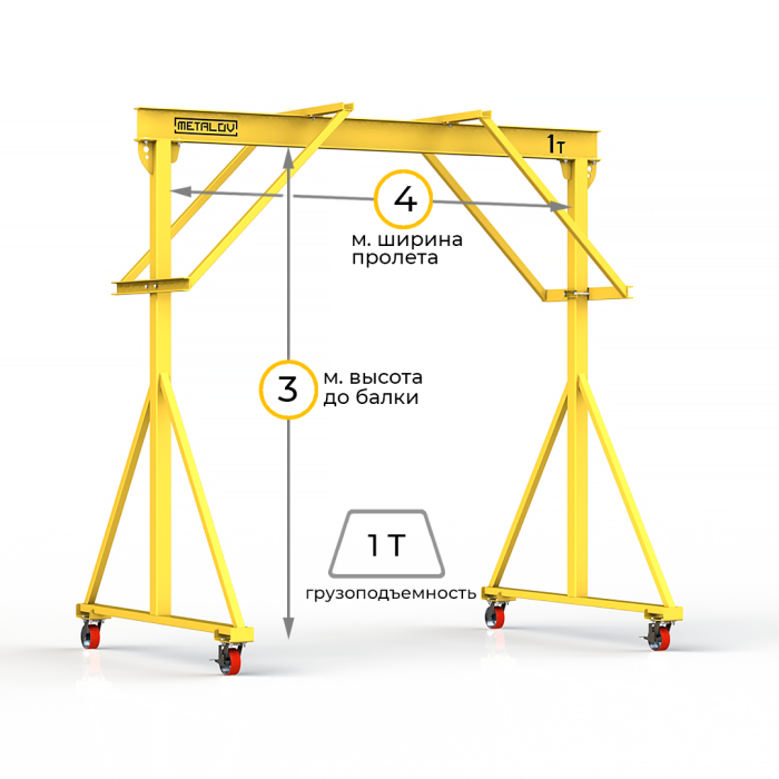 Мини-кран козловой мобильный ручной (МПУ) усиленной конструкции с раскосами Мобиус-R2 с грузоподъемностью до 1 тонны, с высотой до балки 3 метра и шириной пролета 4 метра, это компактное устройство, для подъема и перемещения грузов на небольшие расстояния. Кран адаптирован для работы в помещениях, и может быть использован на улице.