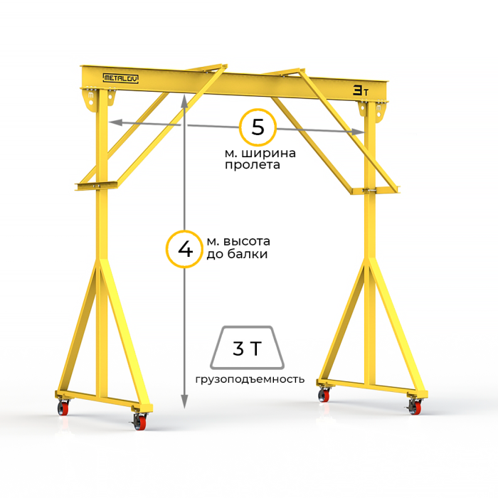 Мини-кран козловой мобильный ручной (МПУ) усиленной конструкции с раскосами Мобиус-R2 с грузоподъемностью до 3 тонн, с высотой до балки 4 метра и шириной пролета 5 метров, это компактное устройство, для подъема и перемещения грузов на небольшие расстояния. Кран адаптирован для работы в помещениях, и может быть использован на улице.