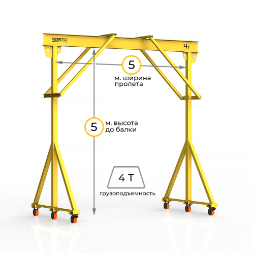Мини-кран козловой мобильный ручной (МПУ) усиленной конструкции с раскосами Мобиус-R2 с грузоподъемностью до 4 тонн, с высотой до балки 5 метров и шириной пролета 5 метров, это компактное устройство, для подъема и перемещения грузов на небольшие расстояния. Кран адаптирован для работы в помещениях, и может быть использован на улице.