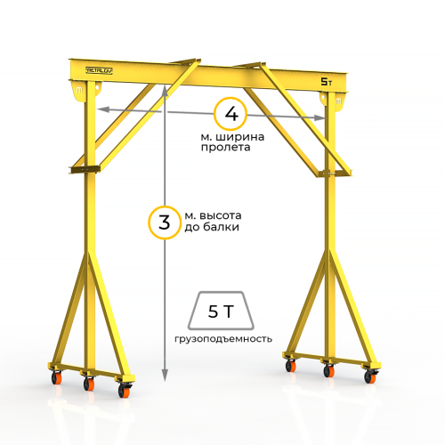 Мини-кран козловой мобильный ручной (МПУ) усиленной конструкции с раскосами Мобиус-R2 с грузоподъемностью до 5 тонн, с высотой до балки 3 метра и шириной пролета 4 метра, это компактное устройство, для подъема и перемещения грузов на небольшие расстояния. Кран адаптирован для работы в помещениях, и может быть использован на улице.