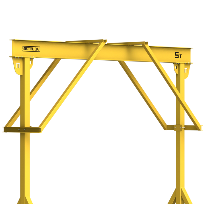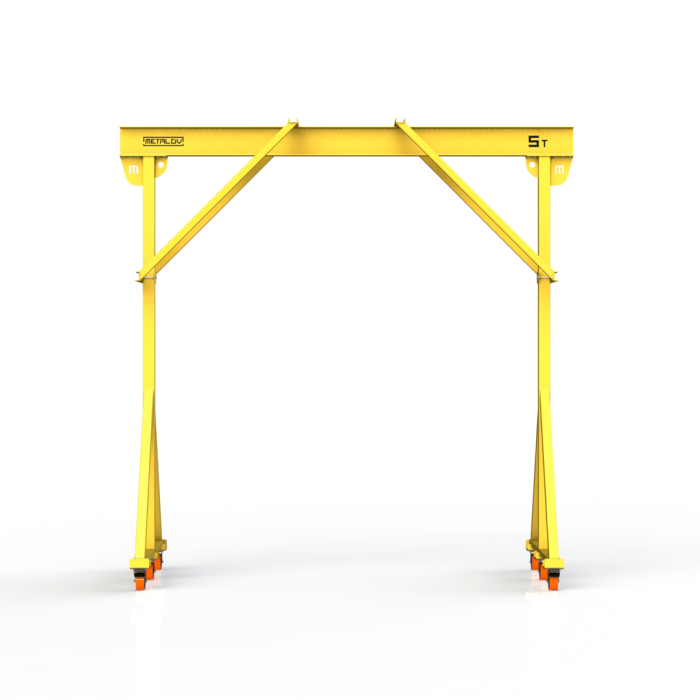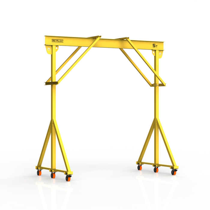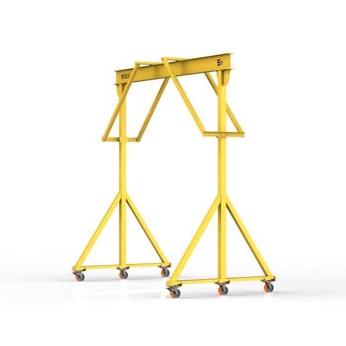 Мини-кран козловой мобильный ручной (МПУ) усиленной конструкции с раскосами Мобиус-R2 с грузоподъемностью до 5 тонн, с высотой до балки 5 метров и шириной пролета 5 метров, это компактное устройство, для подъема и перемещения грузов на небольшие расстояния. Кран адаптирован для работы в помещениях, и может быть использован на улице.