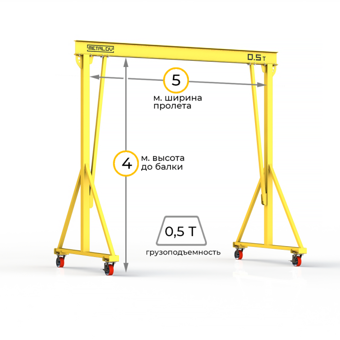 Мини-кран козловой мобильный (МПУ) усиленной конструкции Мобиус-V с грузоподъемностью до 500 килограмм, с высотой до балки 4 метра и шириной пролета 5 метров, это компактное устройство, для подъема и перемещения грузов на небольшие расстояния. Кран адаптирован для работы в помещениях, и может быть использован на улице.