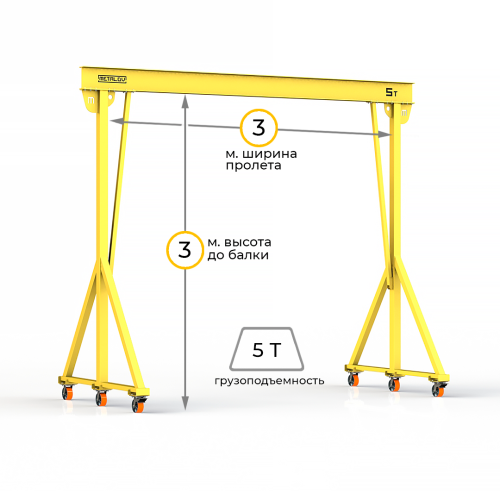 Мини-кран козловой мобильный (МПУ) усиленной конструкции Мобиус-V с грузоподъемностью до 5 тонн, с высотой до балки 3 метра и шириной пролета 3 метра, это компактное устройство, для подъема и перемещения грузов на небольшие расстояния. Кран адаптирован для работы в помещениях, и может быть использован на улице.