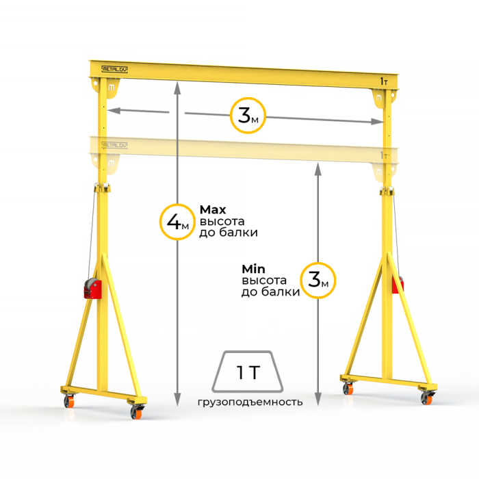 Мини козловой кран мобильный ручной (МПУ) с регулируемой высотой до балки Мобиус-TU имеет грузоподъемность до 1 тонны, минимальная высота составляет 3 метра, максимальная 4 метра. Ширина пролета 3 метра. Кран оборудован телескопическими опорами, высота которых регулируется с шагом в 250 мм, телескопические опоры выдвигаются при помощи ручной лебедки.