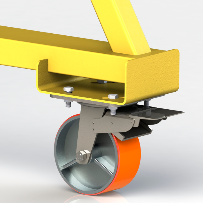 Мини-козловые краны или мобильные перегрузочные устройства нашего производства оборудованы усиленными колесами с полиуретановым покрытием. Все колеса имеют поворотную конструкцию, что обеспечивает легкость и мобильность перемещения. Два колеса оборудованы механическим тормозом, позволяющим зафиксировать положение крана. По заказу возможно изготовление опор в различных комбинациях: поворотные и не поворотные колеса, с тормозом и без тормоза, тормоз только на двух колесах, и так далее, к заказу доступны все возможные варианты.