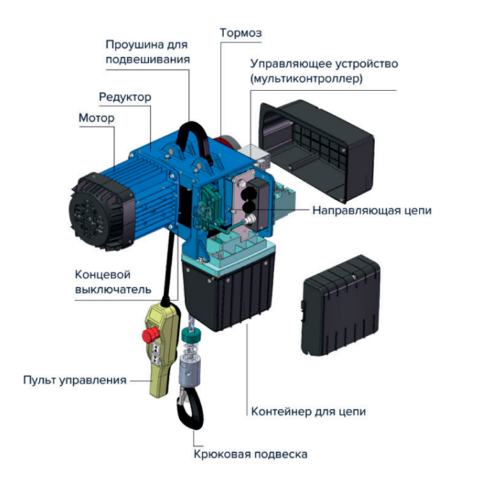 В тали используется цепь из высоколегированной гальванизированной стали (EN 818-7), которая гораздо прочнее и более устойчива к износу чем тросовое исполнение. В отличии от троса, цепь неприхотлива в эксплуатации, и исключено её запутывание. Использование в конструкции цепи позволяет «подтаскивать» грузы под углом до 30 градусов. Кроме того, отсутствие барабана для намотки троса повышает надежность и упрощает обслуживание.