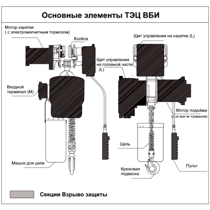 Конструкция тали с ВБИ исполнением предусматривает (зоны) секции взрывозащиты.